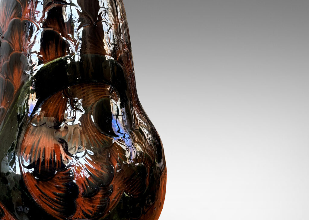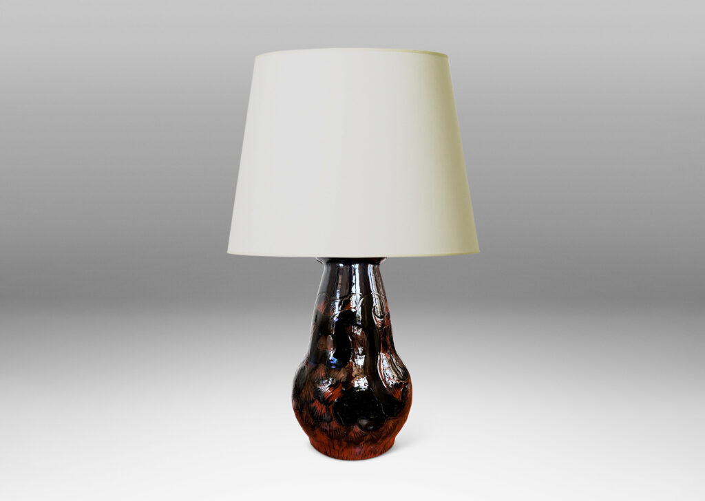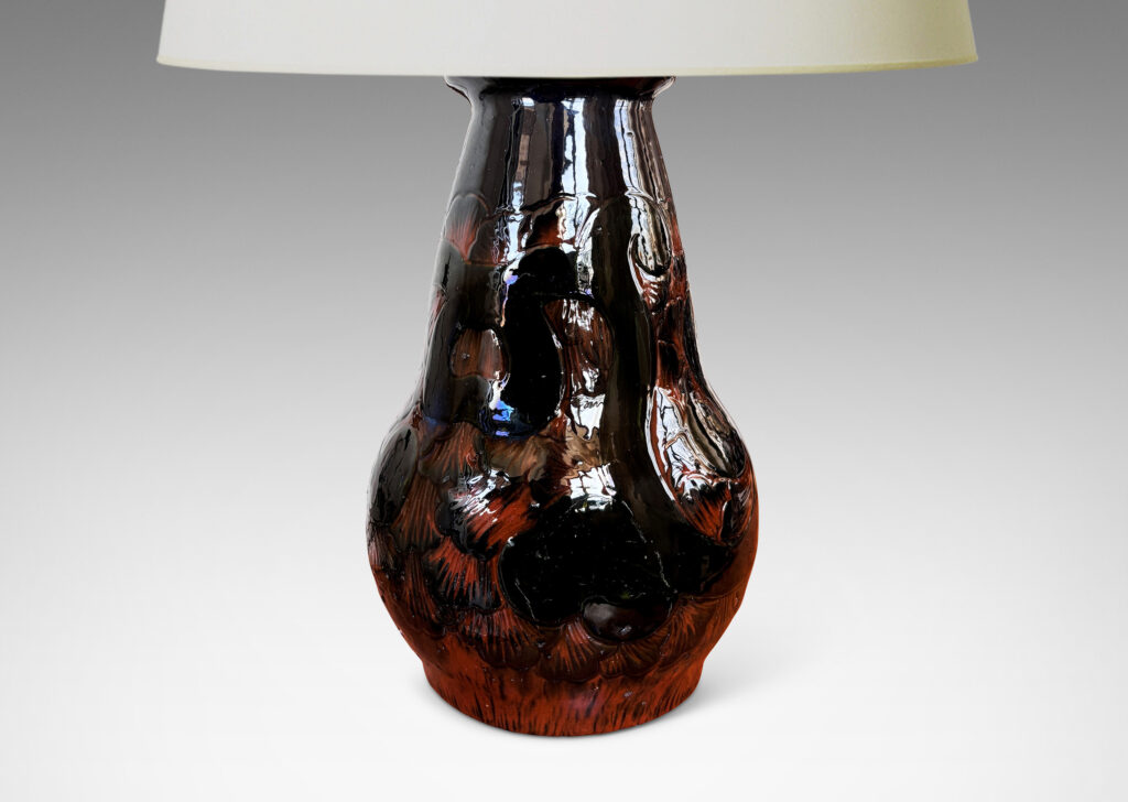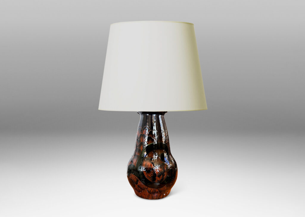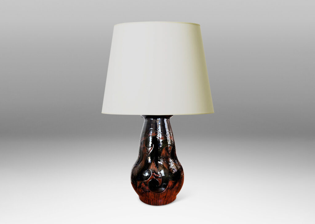 Nordic Art Nouveau / Art Deco table lamp, having bulbous pawn form glazed in black with carved sgraffito scroll and petal design revealing the orange clay body below; earthenware; Denmark, 1920s