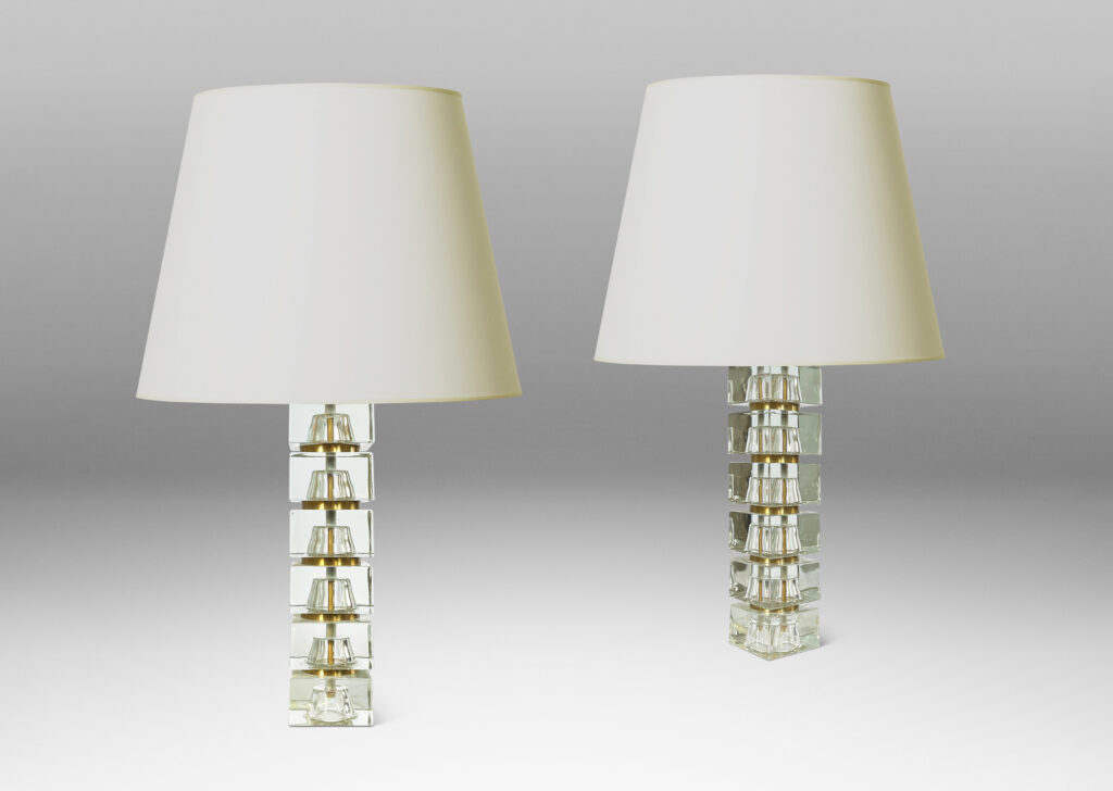 Minimalist pair of table lamps by Carl Fagerlund (1915-2011) for Orrefors, with bases consisting of stacked squared clear glass blocks with round brass separators, cast glass with brass, Sweden, 1960s